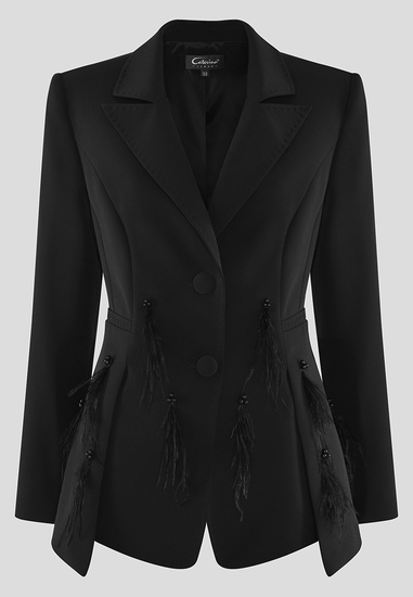 Dłuższy czarny żakiet z haftowanym kwiatem