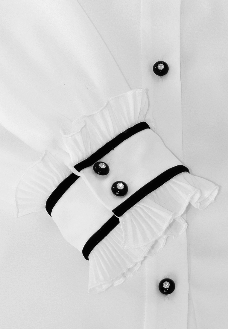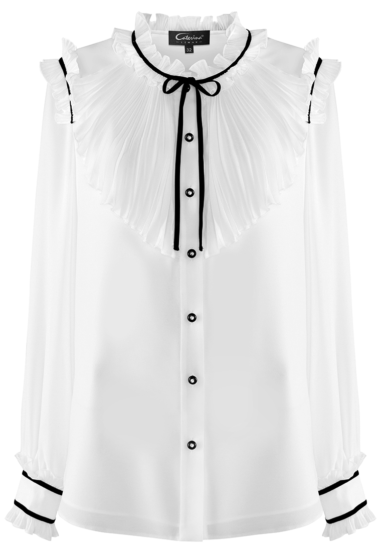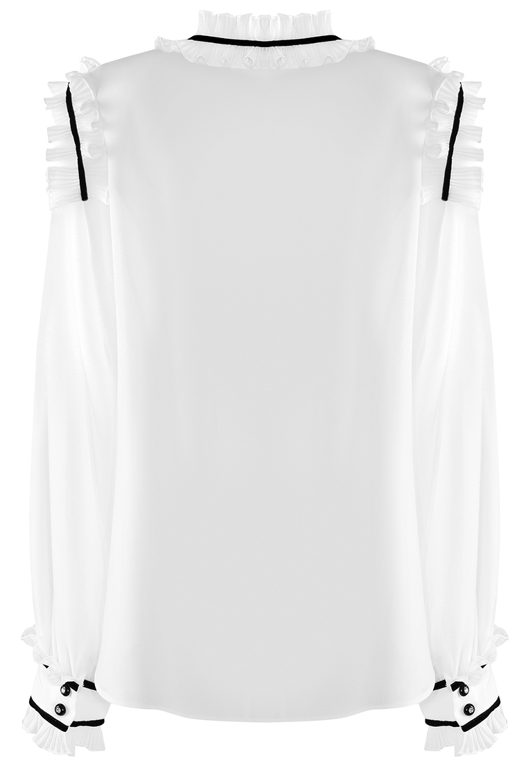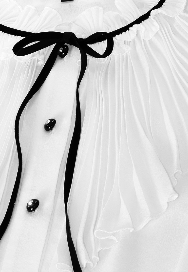 Biała bluzka z kontrastową taśmą. Dekolt ze stójką w formie marszczenia i oryginalnym, plisowanym żabotem.