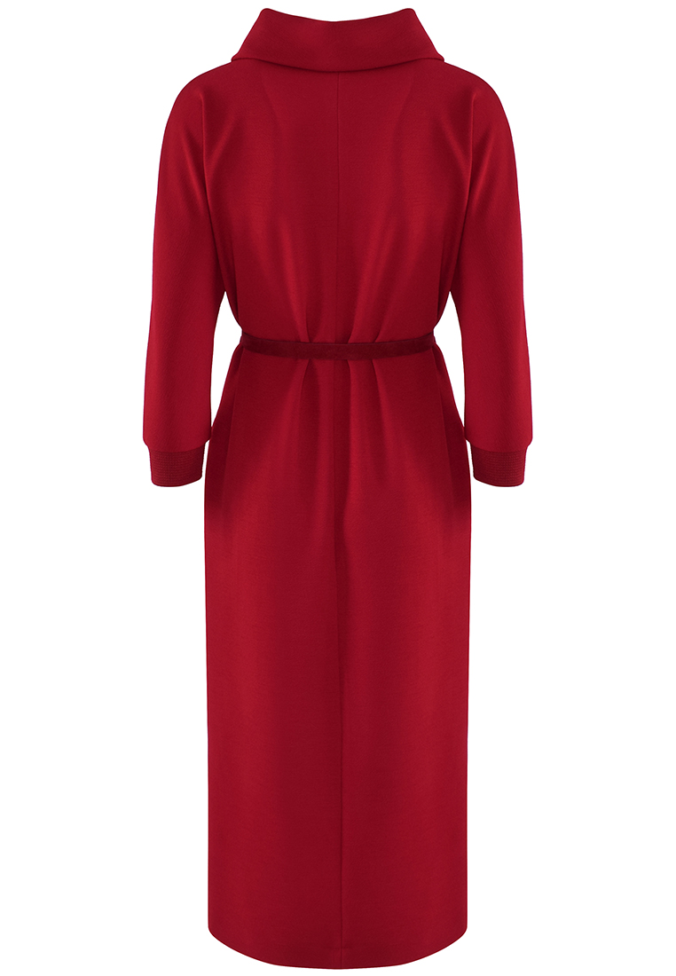 Bordowa sukienka z wysokim golfem, ozdobionym dwoma guzikami. Tkanina mięsista, ze strukturą.