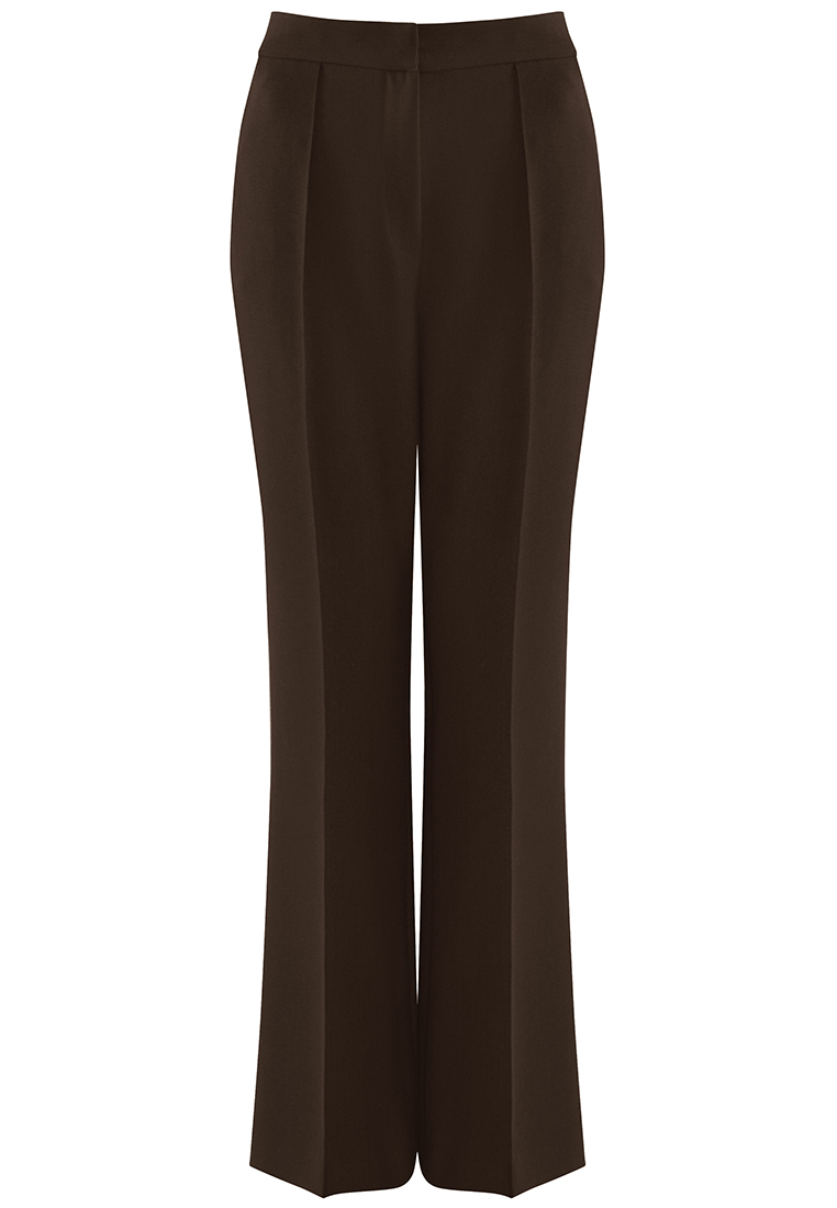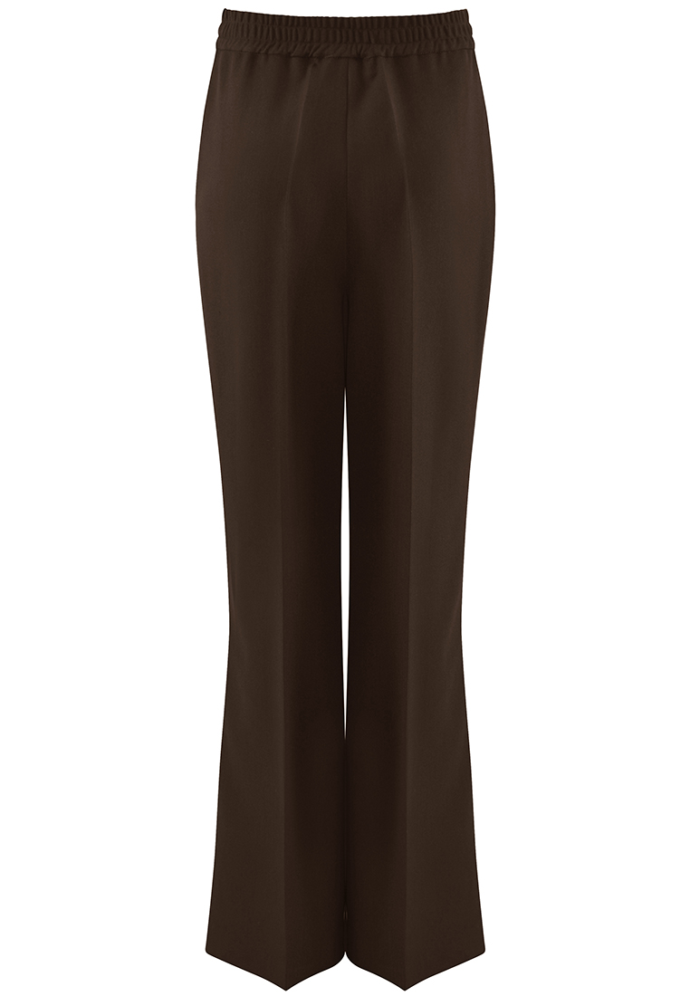 Brązowe spodnie z szerokimi nogawkami. Forma nogawek prosta.