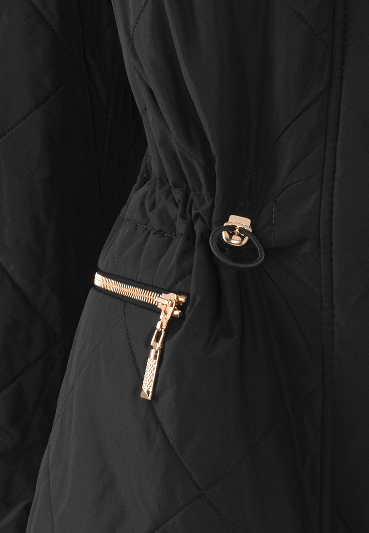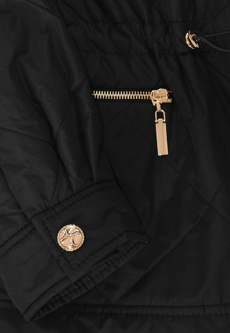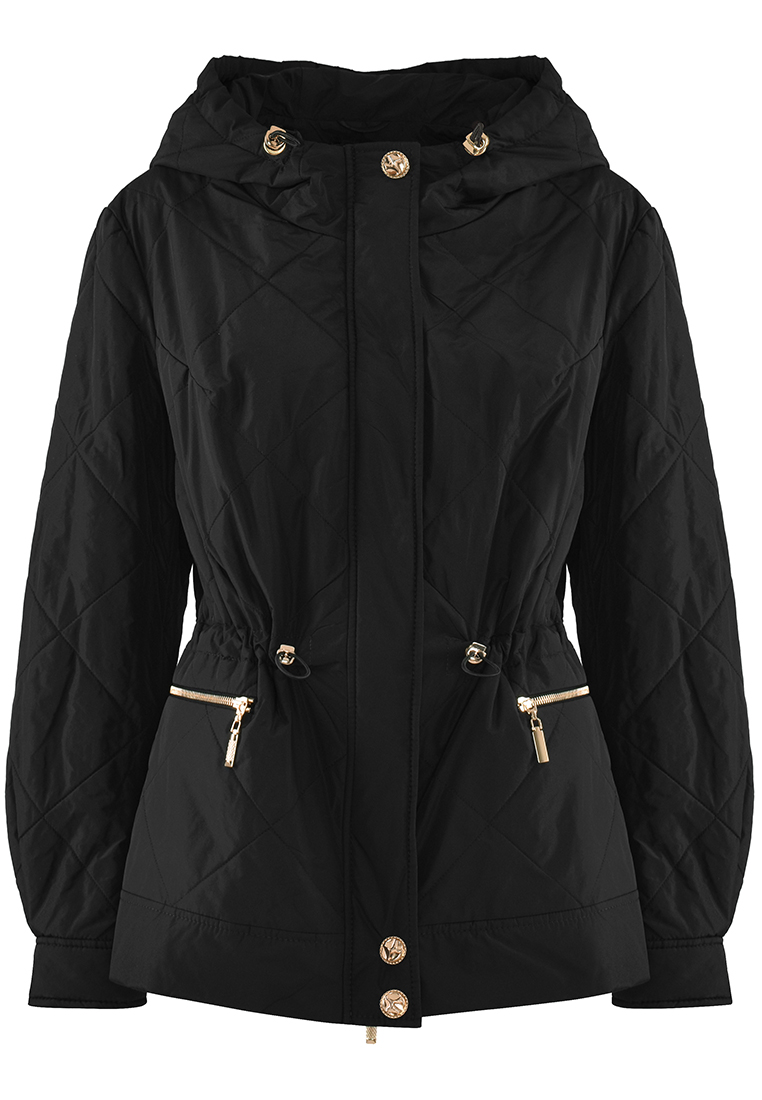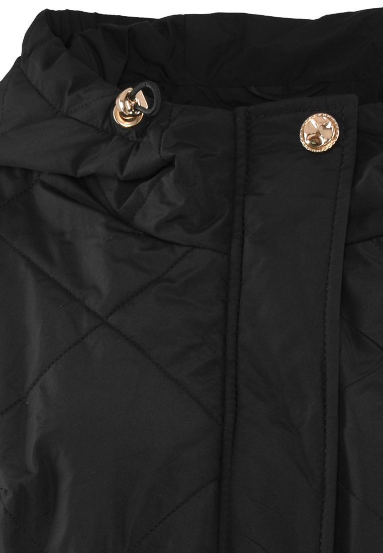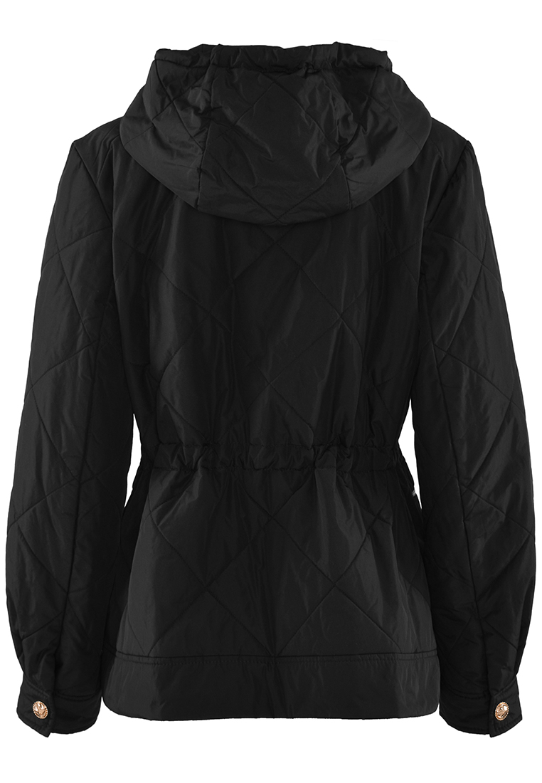 Czarna kurtka z pikowanej tkaniny. Przy dekolcie stójka, przechodząca w kaptur.