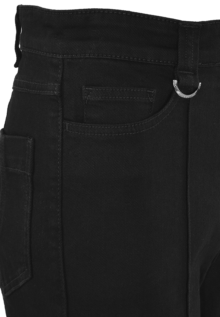 Przeszycia w nogawkach tworzące kant. Zapięcie na suwak i guzik.