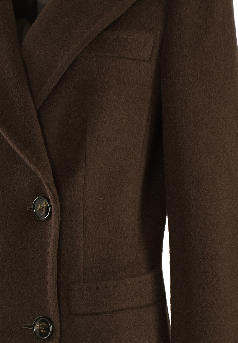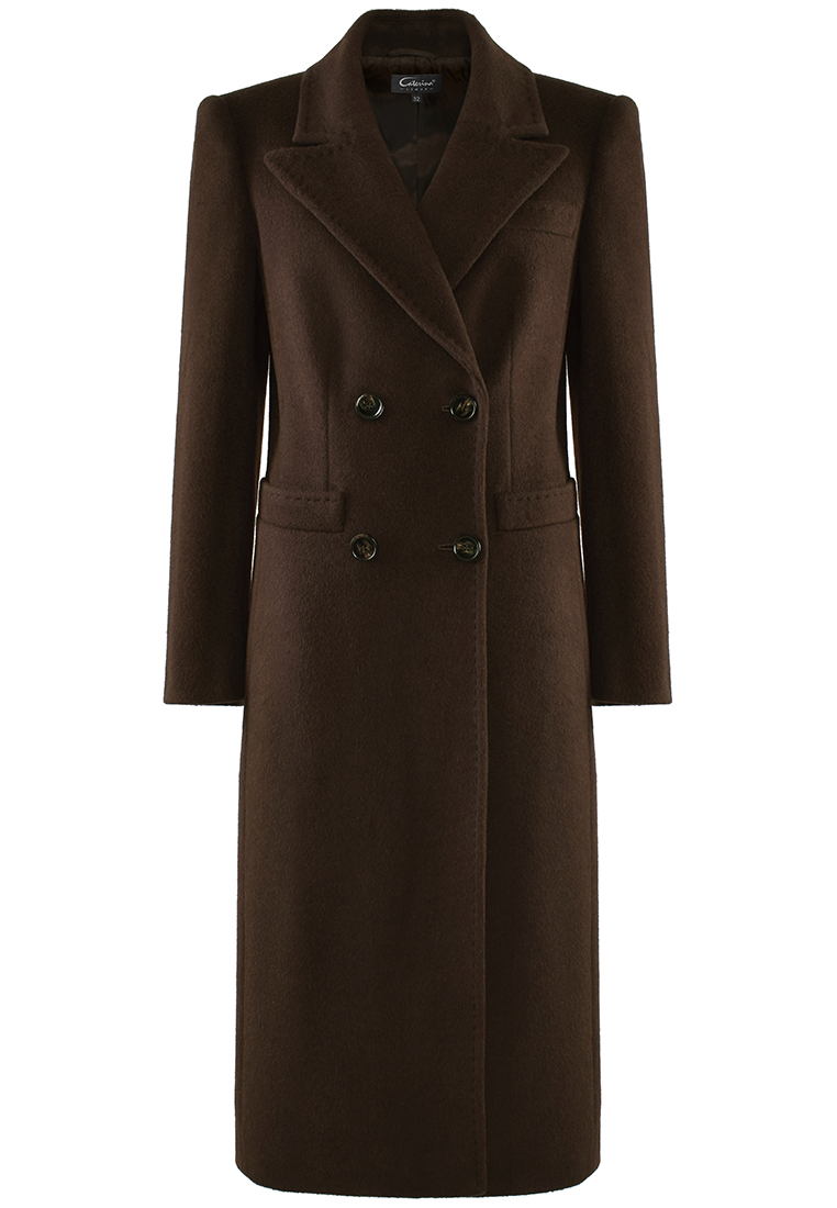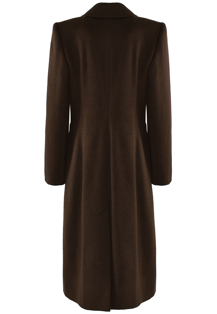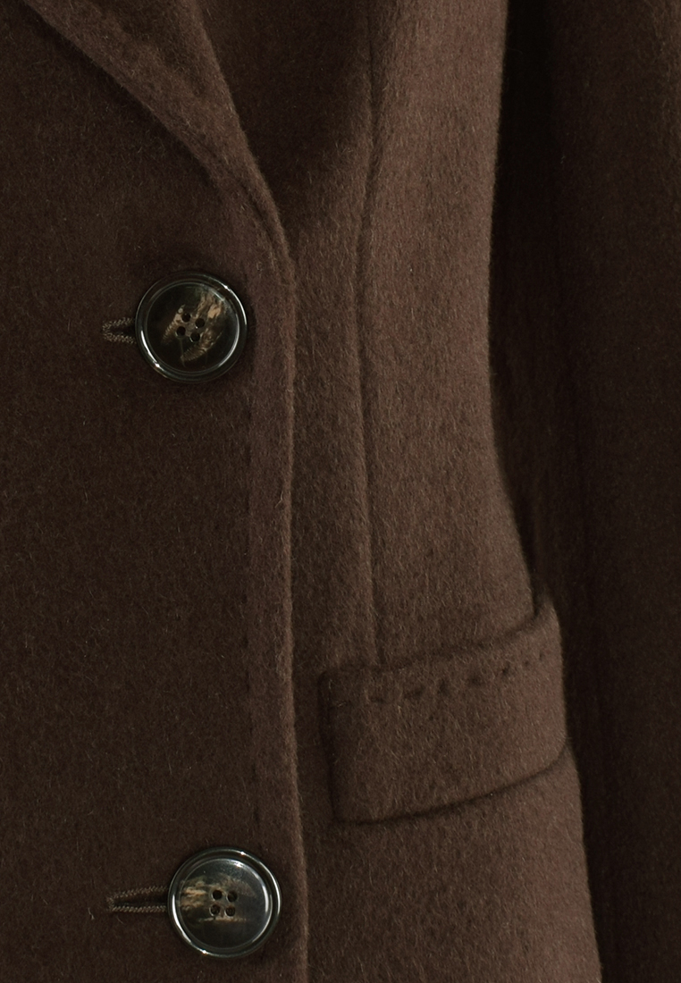 Klasyczny płaszcz w kolorze ciemnej czekolady. Tkanina z dużą zawartością wysokiej jakości wełny i alpaki.