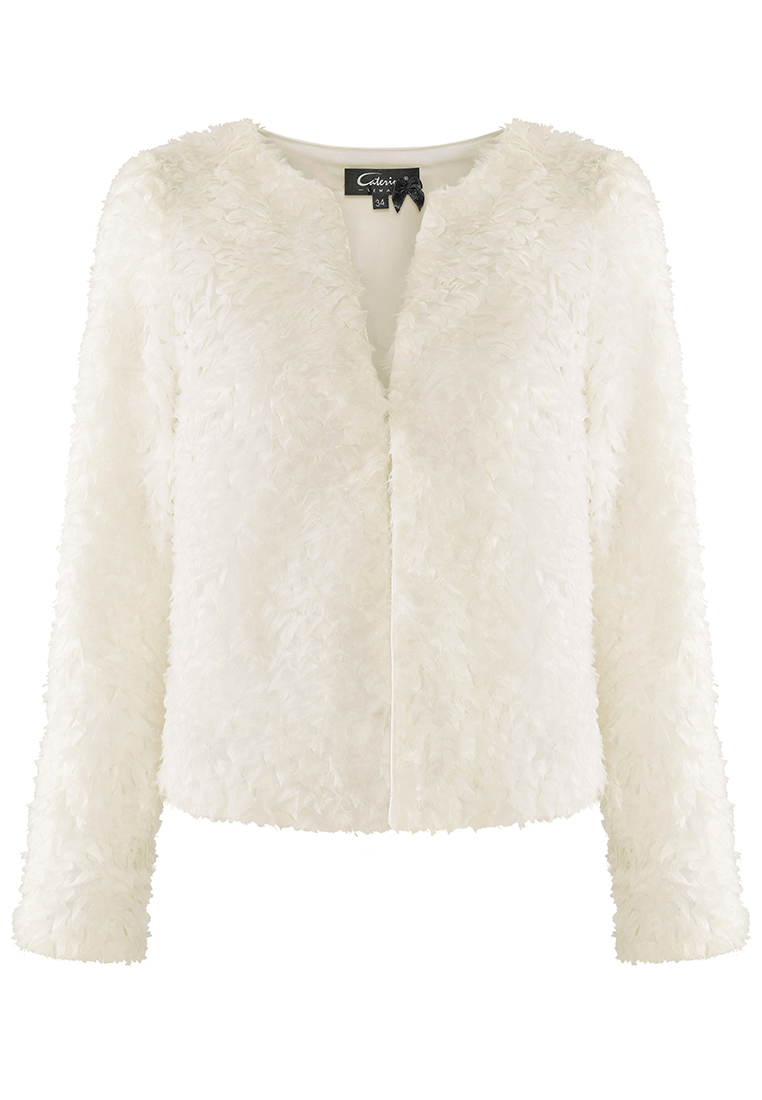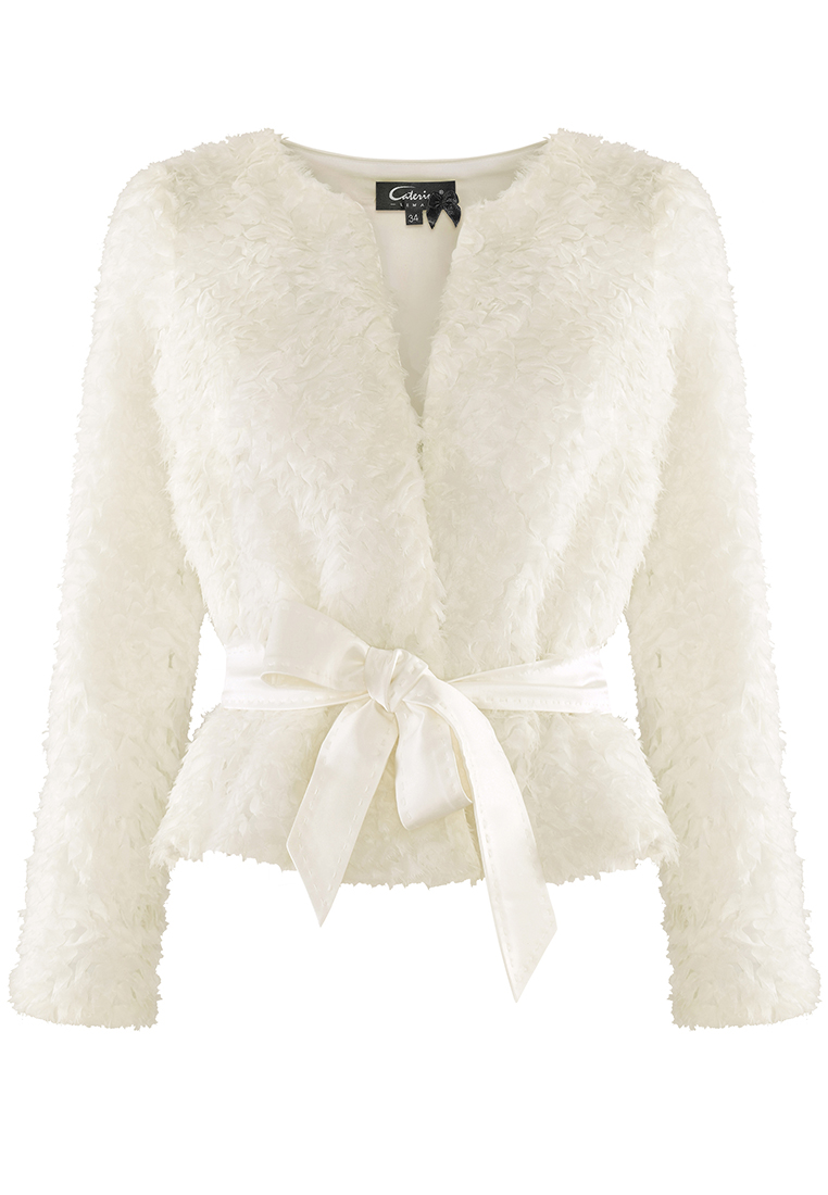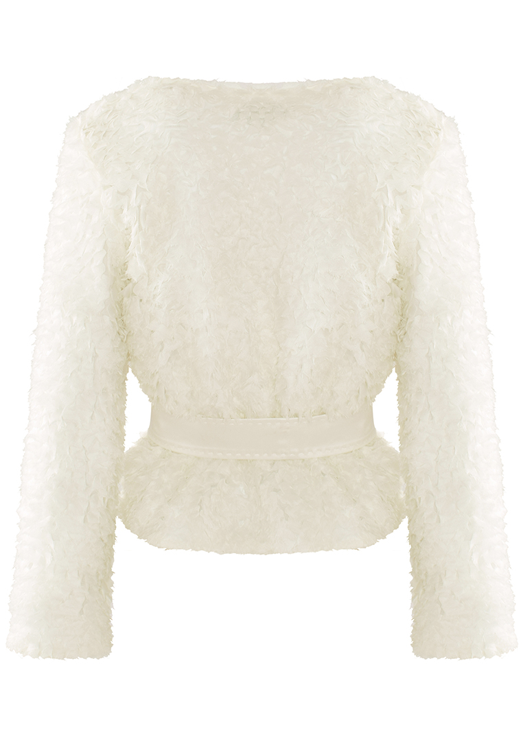 Kremowy żakiet typu bolerko z oryginalnej, przestrzennej tkaniny.
