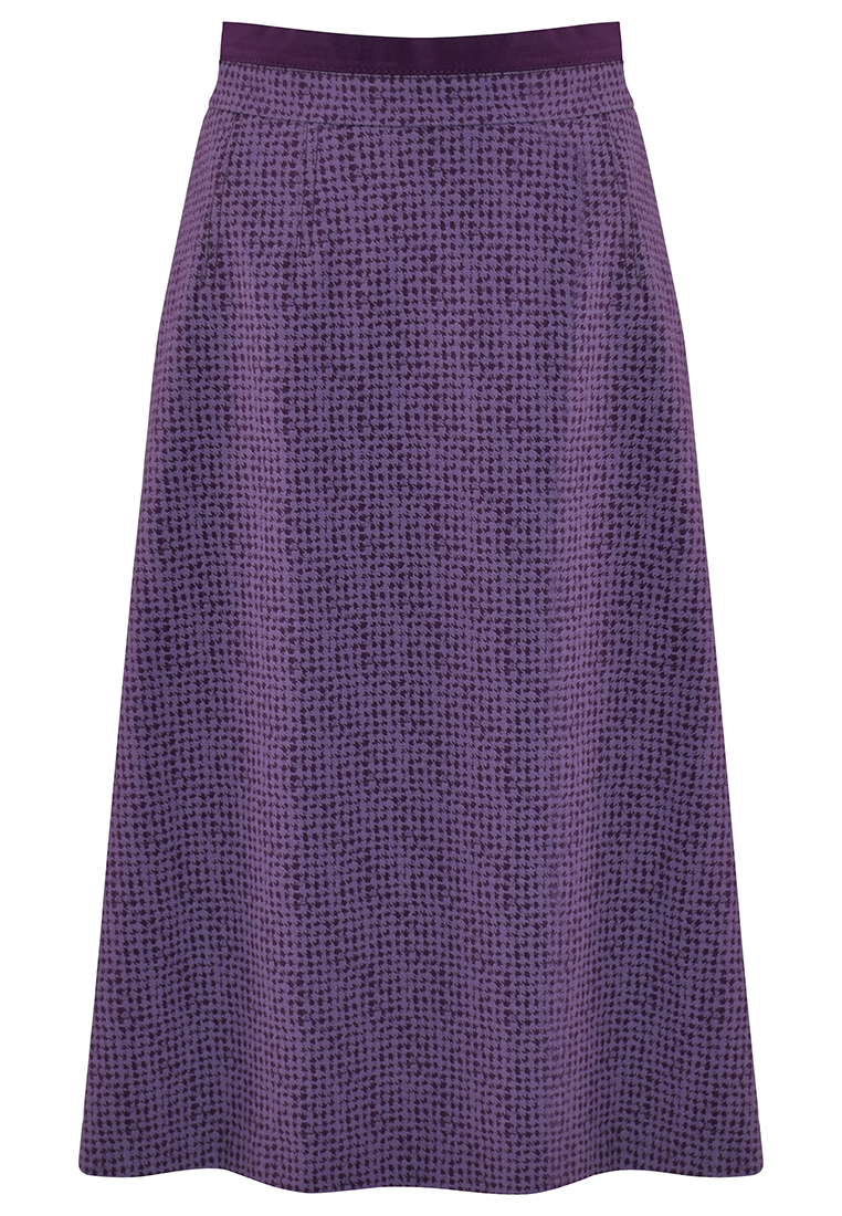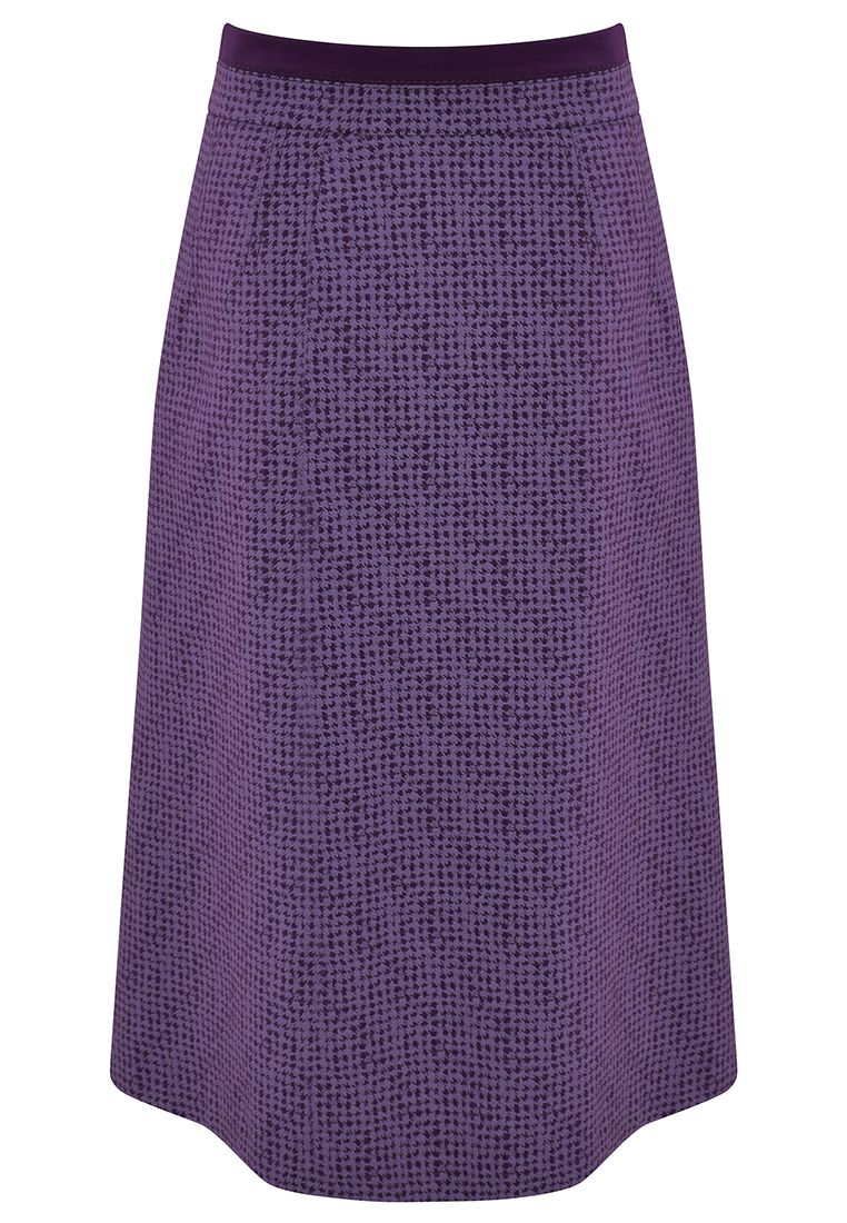 Fioletowa spódnica z motywem kurzej stopki. Forma litery A.