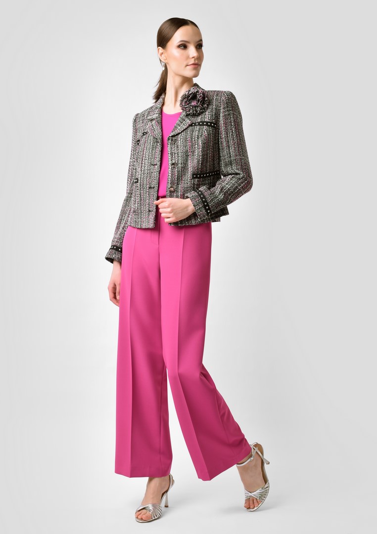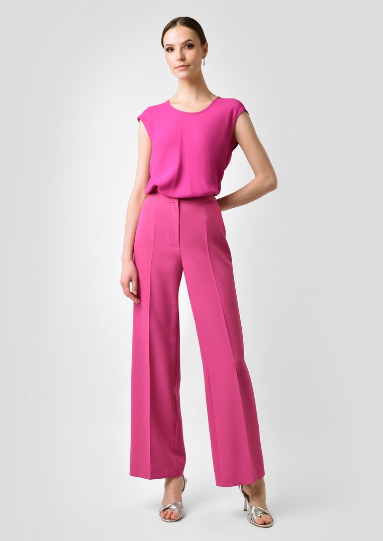 Eleganckie spodnie w kolorze fuksji. Forma nogawek szeroka, prosta, z kantem.