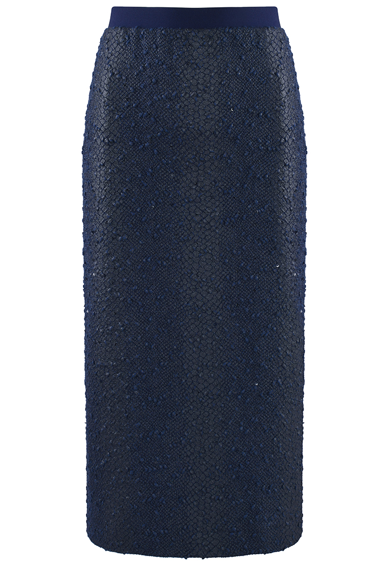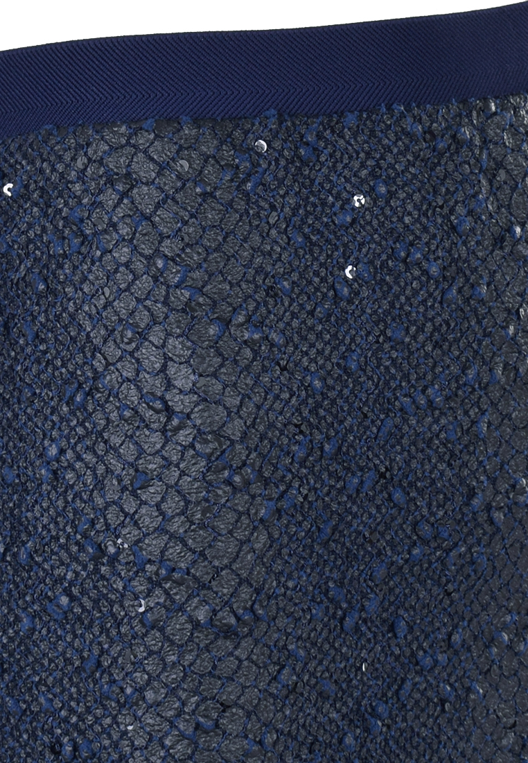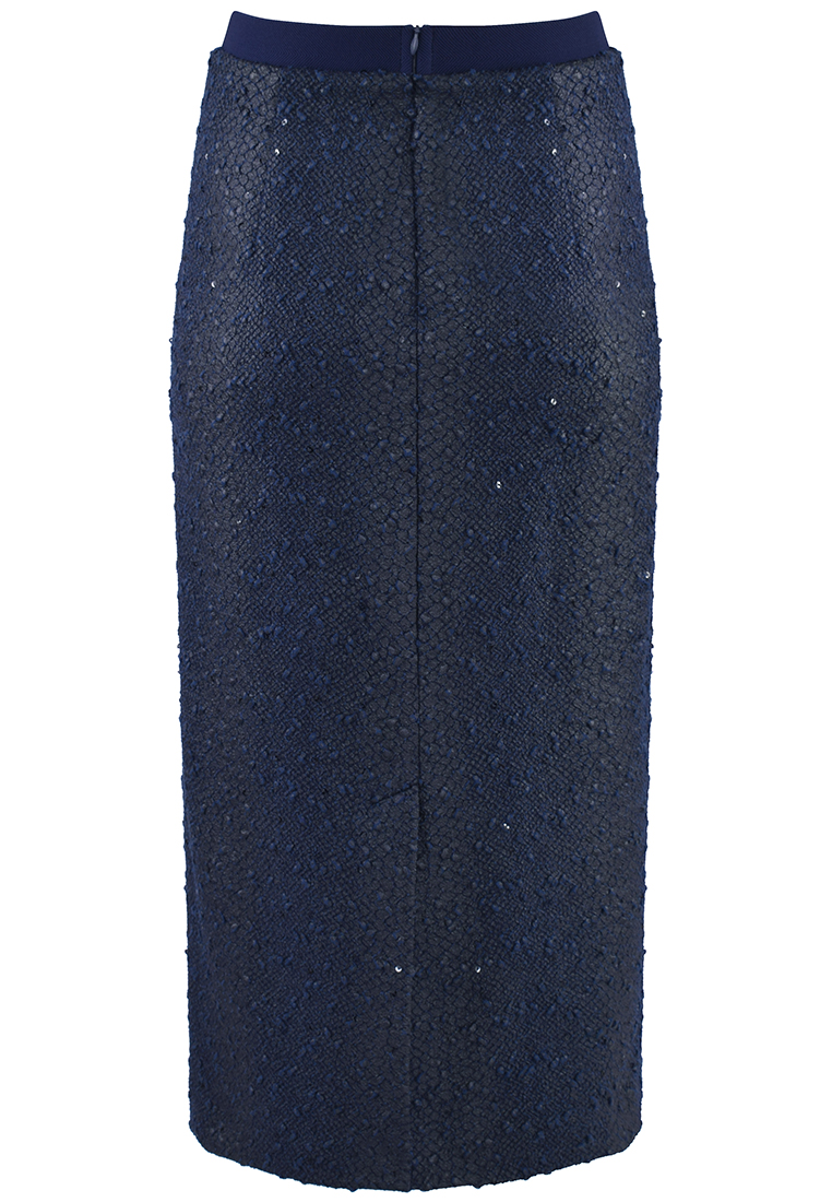 Granatowa spódnica ołówkowa. Tkanina typu bucle z drobnymi cekinami.