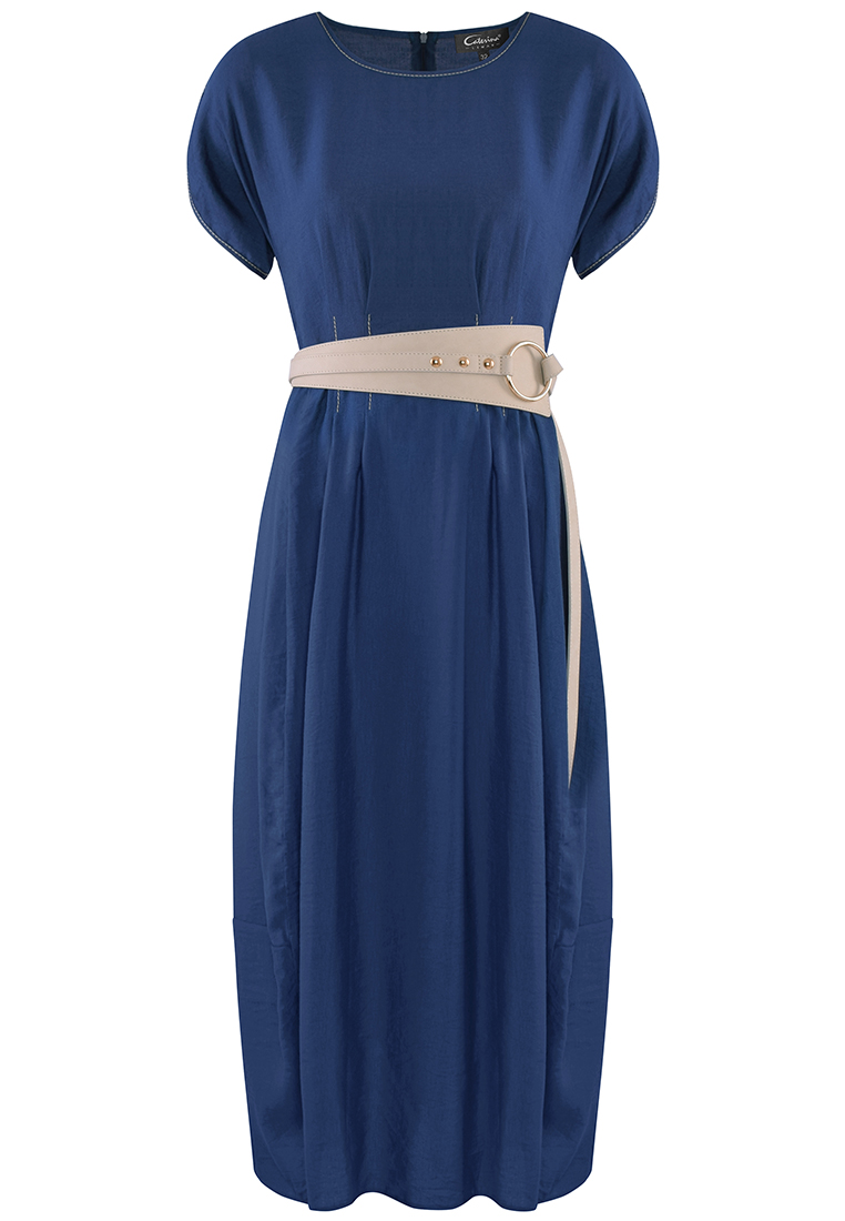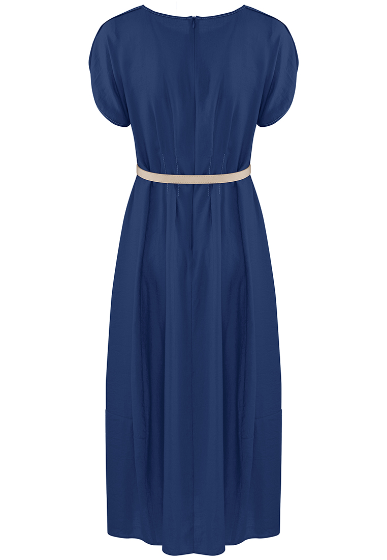 Granatowa sukienka z naturalnie gniecionej tkaniny. Forma swobodna.