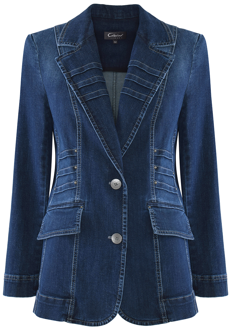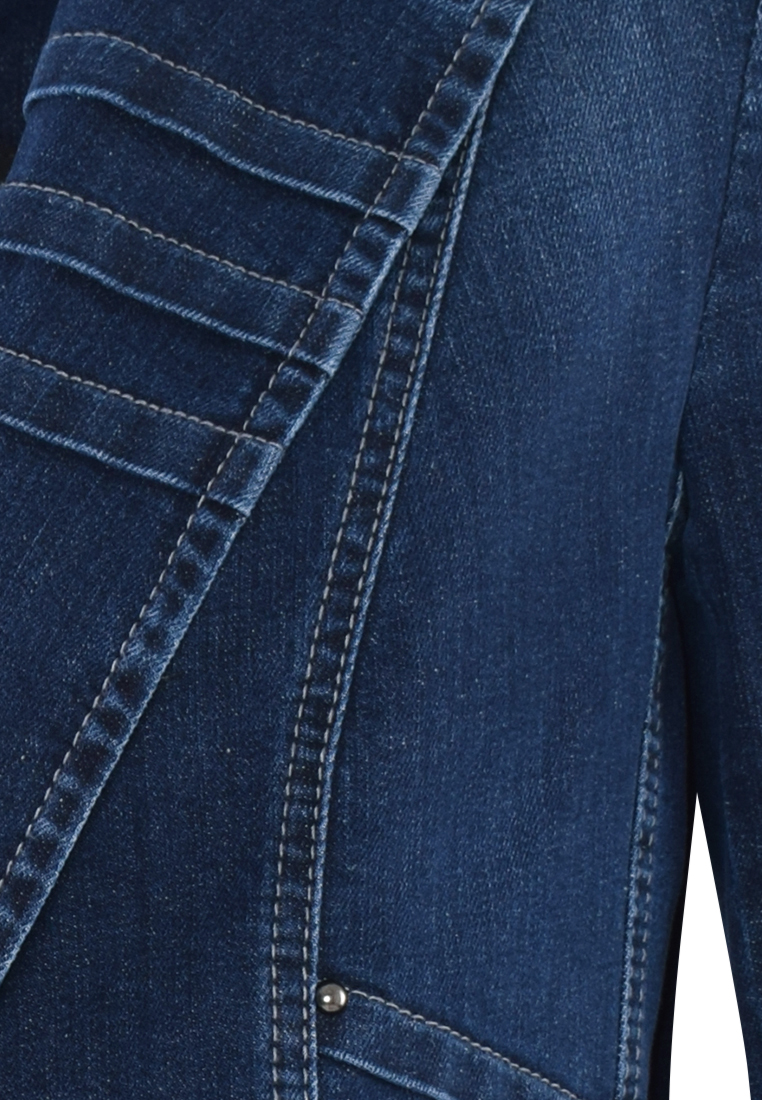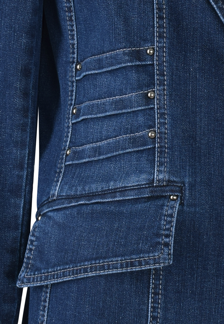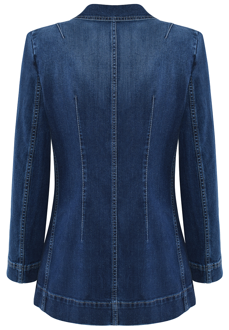 Granatowy żakiet z jeansowej tkaniny. Forma klasyczna, dłuższa, dopasowana do sylwetki.