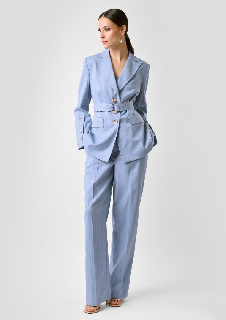 Niebieskie spodnie w prążek. Nogawka o prostej formie.