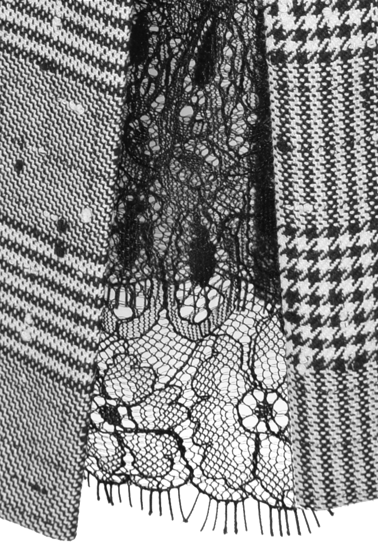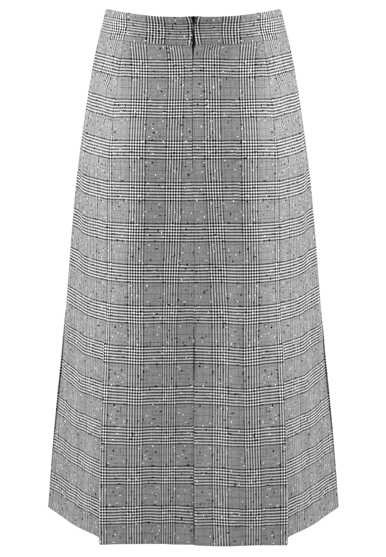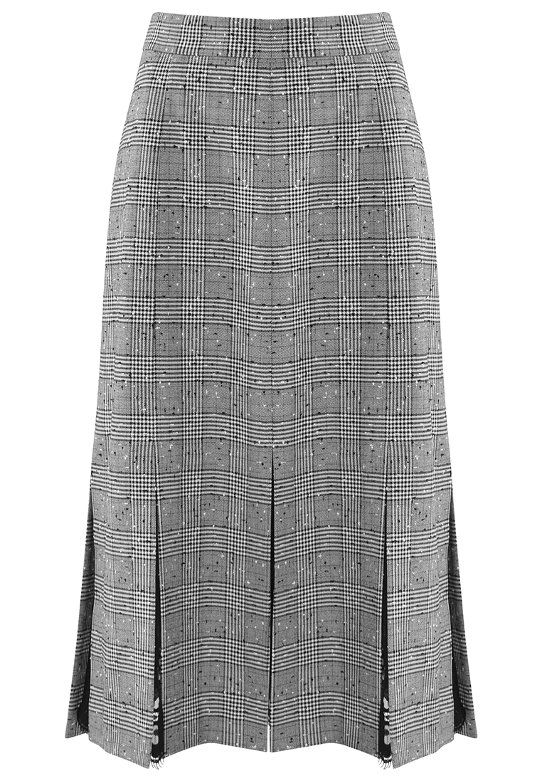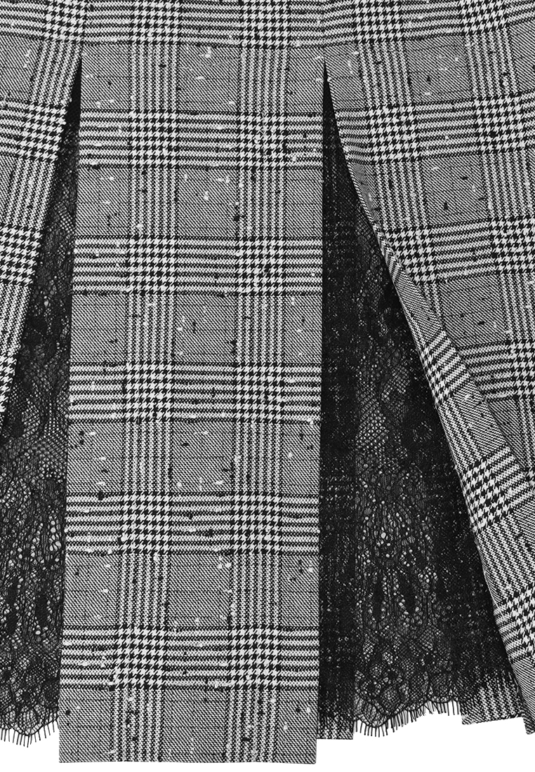 Elegancka spódnica w kratę. Forma lekko rozszerzana dołem, ułożonym w kontrafałdy. Ciekawe połączenie tkaniny z koronką.