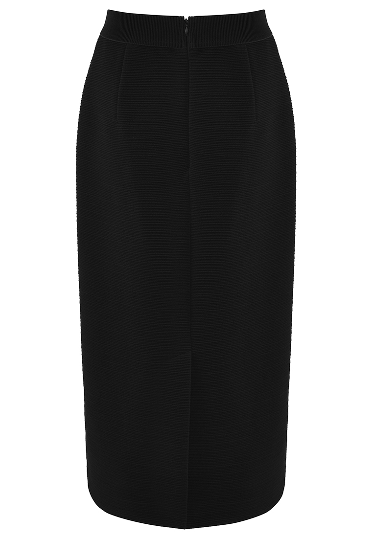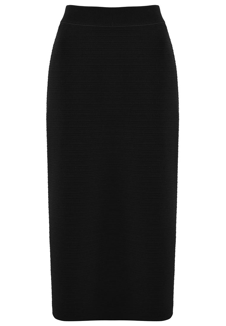 Czarna spódnica z elastycznej tkaniny. Forma prosta, otulająca.