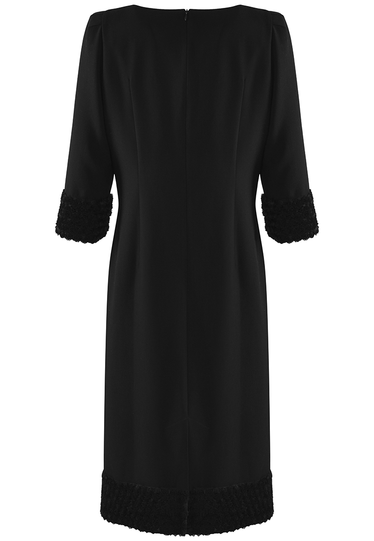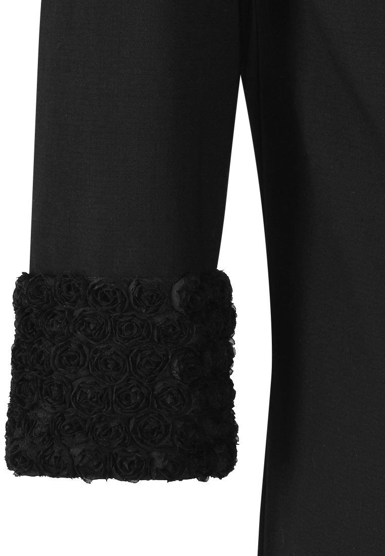 Ozdobne wykończenie dołu sukienki i rękawów pasem koronki z przestrzennymi różyczkami.