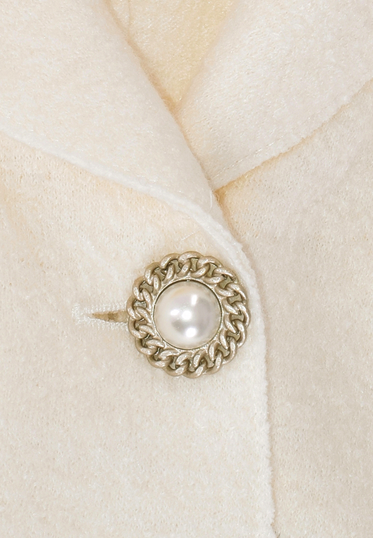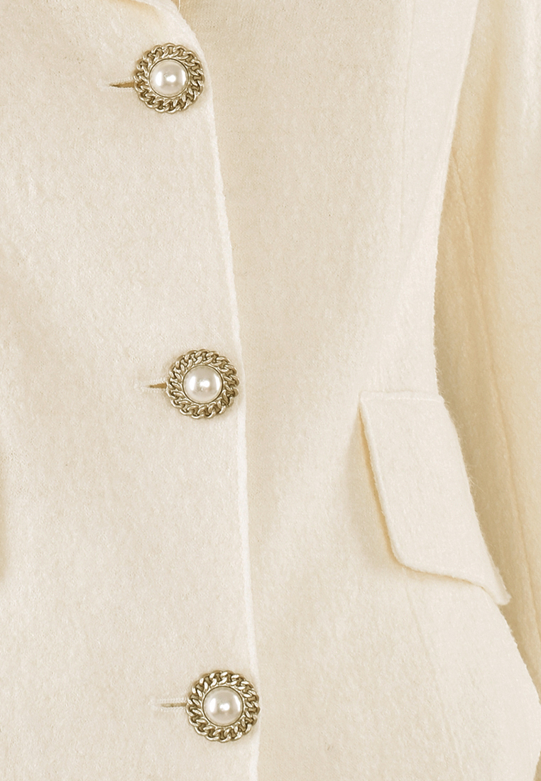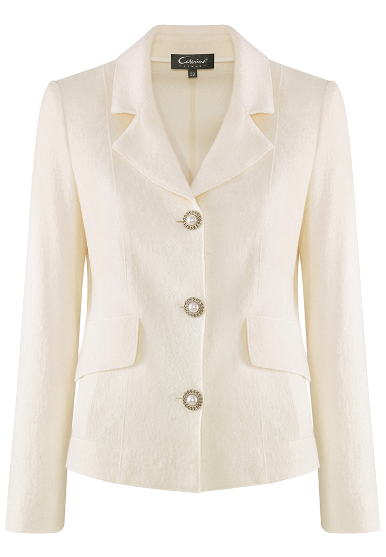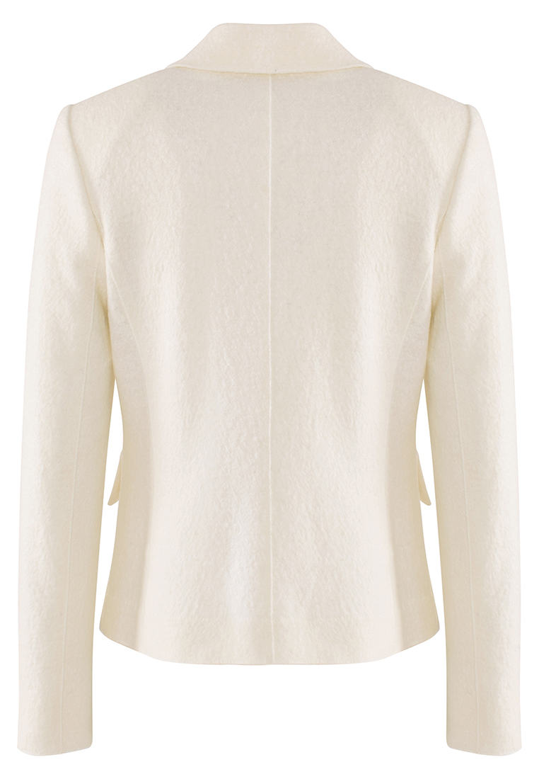Letni żakiet z wełny o klasycznym fasonie, z lekko modelującymi cięciami. Krawędzie celowo niewykończone, zabezpieczone stebnówkami.